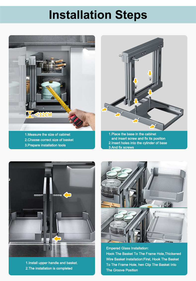 2 -Tier Basket Organizer :- The Pull out basket with 2-layer design can make full use of your blind corner areas in the cabinets, offering more storage space to your kitchen. Smooth pulling :- The adjustable pull out basket with solf close can be pull out easily. Easy to Assemble : - The pull out basket is easy to install. You just need to fix the frame in the cabinet first and then hang the baskets on it. The door width must be larger than 410mm, otherwise, you can not pull it out fully. Considerate design :- The height of layer is adjustable by holes. The heighten fench of glass aims to protect items from falling down. A considerate design for a home storage in kitchen area. "
